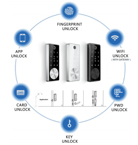• 6 ways to unlock: Wi-Fi deadlock app access, Bluetooth app access, fingerprint deadlock unlocking mechanism, PIN code, card and mechanical key unlock